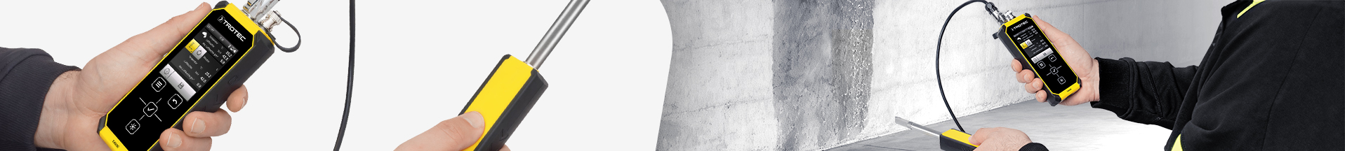 Als zentrales Messgerät arbeitet das T4000 mit austauschbaren Sensoren und Elektroden. Je nach angeschlossener Komponente lassen sich Material- und Holzfeuchte, Raumklima, Tiefenfeuchte, Luftströmung oder Leckagen per H₂-Tracer-Gas erfassen.
